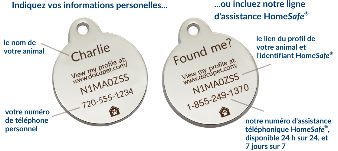 Tous les renseignements de votre animal sont inclus dans son profil en ligne, et associés à sa médaille. Toute personne qui trouve votre animal peut facilement consulter son profil sécurisé en ligne, créer un rapport d’animal trouvé qui vous sera automatiquement envoyé, ou appeler notre ligne d’assistance HomeSafe® disponible 24 h/24, 7 j/7 pour faciliter la réunion.