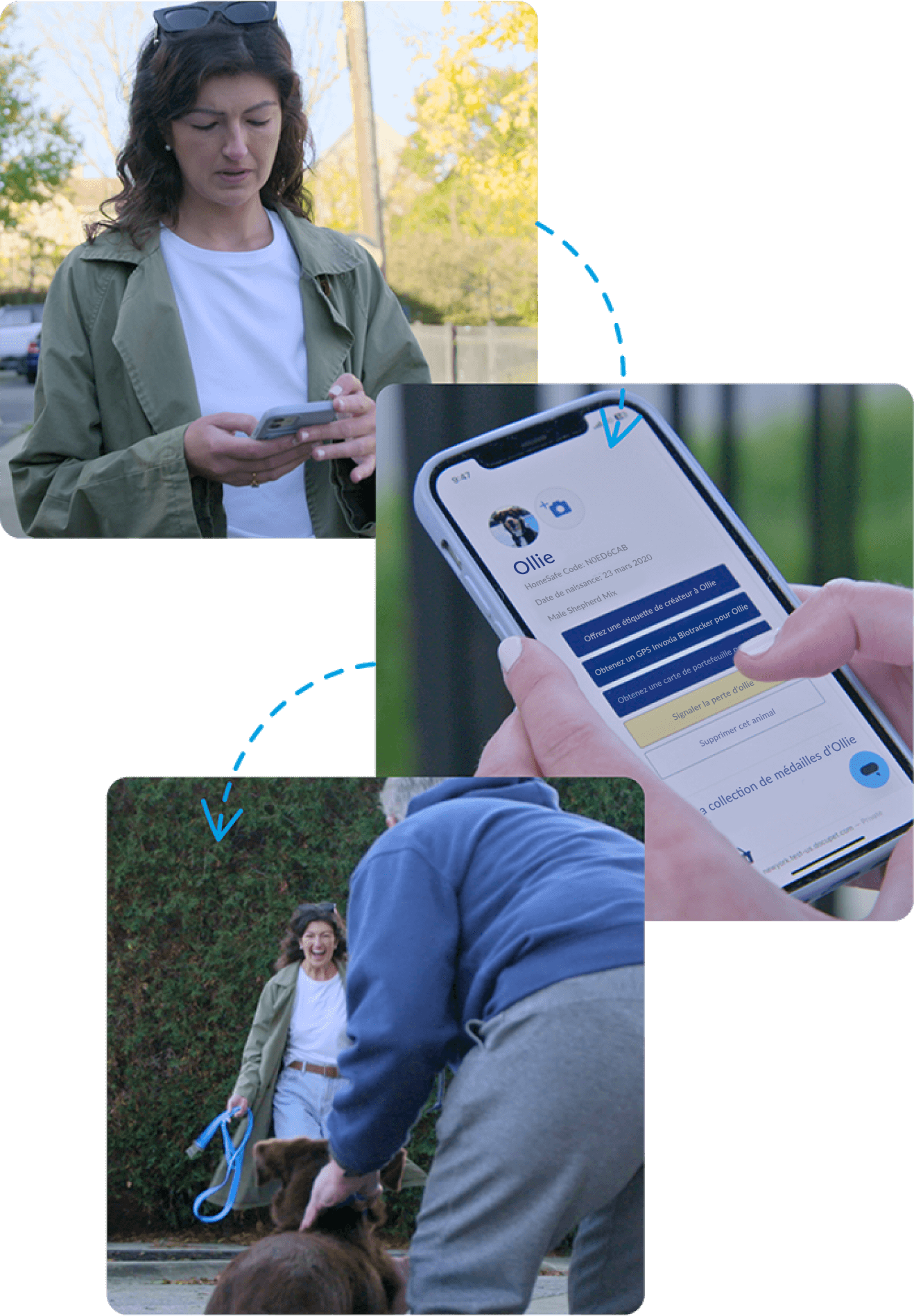 En un clic, un rapport d’animal perdu peut être créé, déclenchant immédiatement des actions pour diffuser l’avis, identifier et retrouver votre animal.